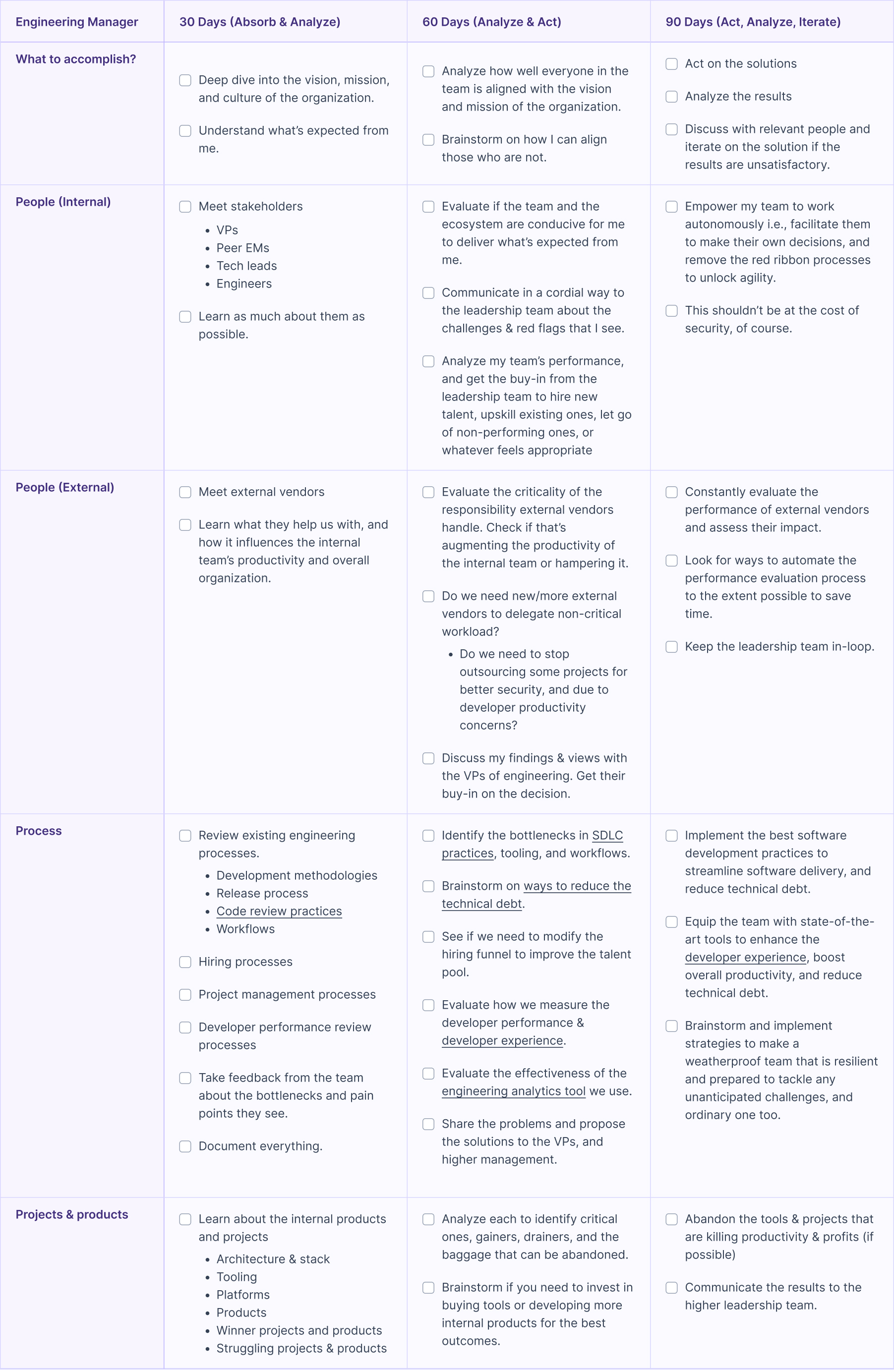 When you transition from being an individual contributor (IC) to an engineering manager’s role, things change a lot. It’s easy to get overwhelmed by incoming requests, make blunders, or succumb to pressure. But that’s avoidable if you have clarity around what to focus on in your early days, and what to ignore. Accordingly, you can design an effective 30-60-90 day plan. Here, you’ll find a comprehensive list of tasks that should be in your 30-60-90 day plan for engineering managers. You may extend/modify this to suit your specific case.